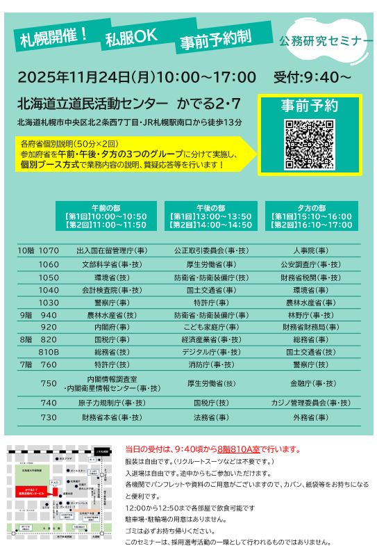 各府省の職員が各部屋で、本府省の業務概要、直面する政策課題(取組み、今後の展望等)、仕事の魅力ややりがいなどを説明します。(このセミナーは、採用・選考活動とは一切関係ありません。)