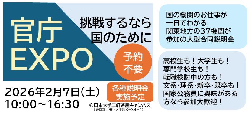 2月7日(土)に実施する37の国の機関が集まる合同対面形式のセミナー、官庁EXPOについて掲載しております。