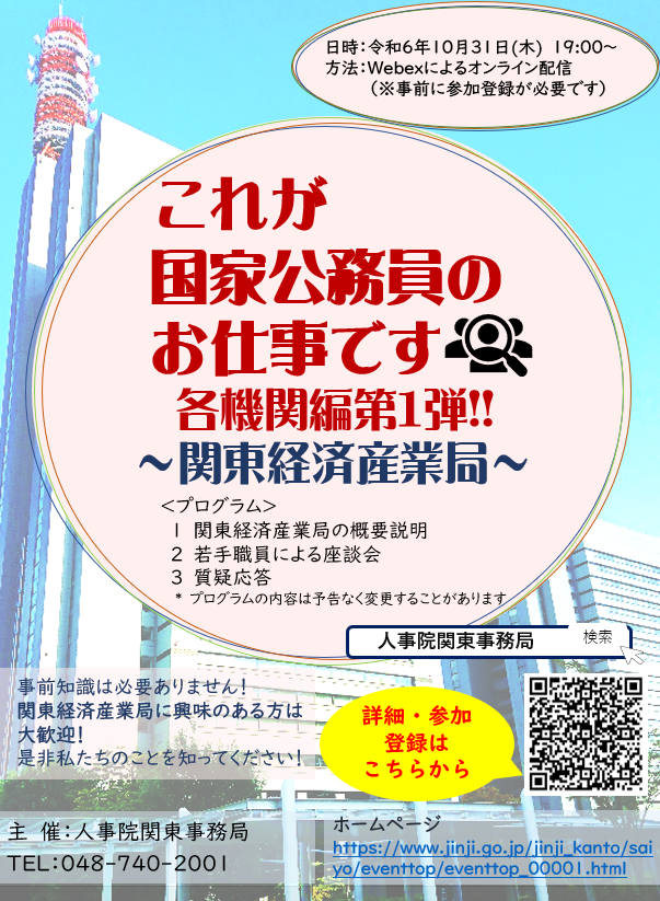 <プログラム> 1 関東経済産業局の概要説明 2 若手職員による座談会 3 質疑応答 (※)プログラムの内容は予告なく変更することがあります |