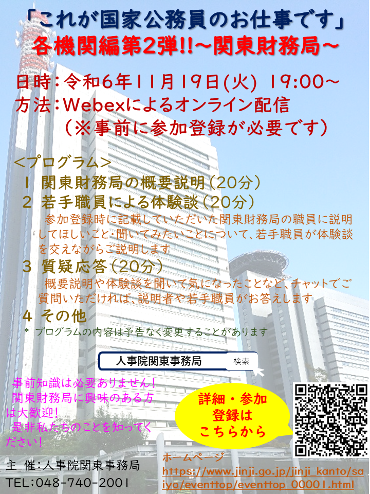 <プログラム>【事務系】 1 関東財務局の概要説明(20分) 2 若手職員による座談会(20分) 参加登録時に記載していただいた関東財務局の職員に説明してほしいこと・聞いてみたいことについて、若手職員が体験談を交えながらご説明します 3 質疑応答(20分) 概要説明や体験談を聞いて気になったことなど、チャットでご質問いただければ、説明者や若手職員がお答えします 4 その他 (※)プログラムの内容は予告なく変更することがあります |
