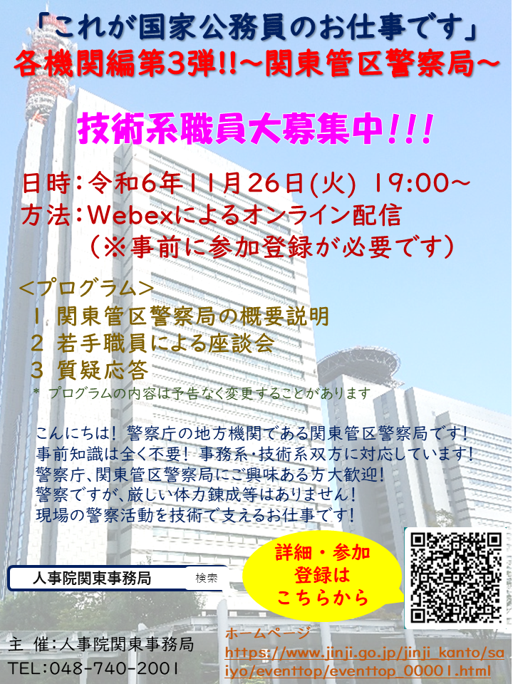 <プログラム> 【事務系】【技術系】 1 関東管区警察局の概要説明 2 若手職員による座談会 3 質疑応答 (※)プログラムの内容は予告なく変更することがあります |