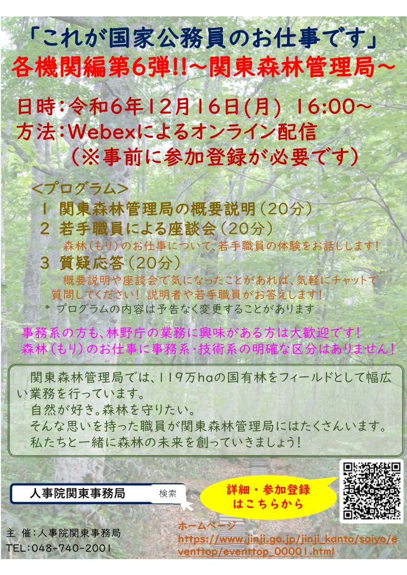 <プログラム> 【事務系】【技術系】 1 関東森林管理局の概要説明(20分) 2 若手職員による座談会(20分) 森林(もり)のお仕事について、若手職員の体験をお話しします! 3 質疑応答(20分) 概要説明や座談会で気になったことがあれば、気軽にチャットで質問してください! 説明者や若手職員がお答えします! (※)事務系の方も、林野庁の業務に興味がある方は大歓迎です! 森林(もり)のお仕事に事務系・技術系の明確な区分はありません! (※)プログラムの内容は予告なく変更することがあります |