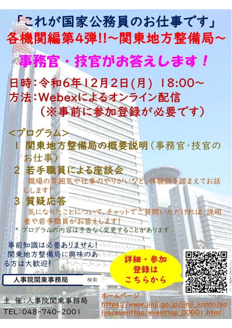 <プログラム> 【事務系】【技術系】 事務官・技官がお答えします! 1 関東地方整備局の概要説明(事務官・技官のお仕事) 2 若手職員による座談会 職場の雰囲気や仕事のやりがいなど、体験談を踏まえてお話しします! 3 質疑応答 気になったことについて、チャットで質問を頂ければ説明者や若手職員がお答えします! (※)プログラムの内容は予告なく変更することがあります |