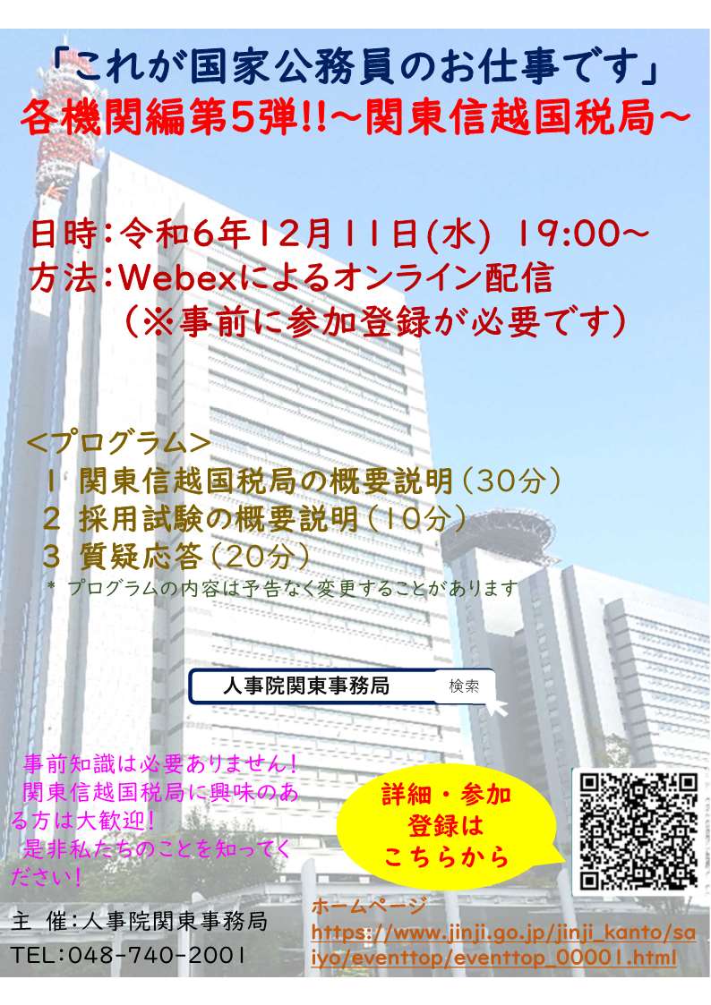 <プログラム> 【事務系】 1 関東信越国税局の概要説明(30分) 2 採用試験の概要説明(10分) 3 質疑応答(20分) (※)プログラムの内容は予告なく変更することがあります |