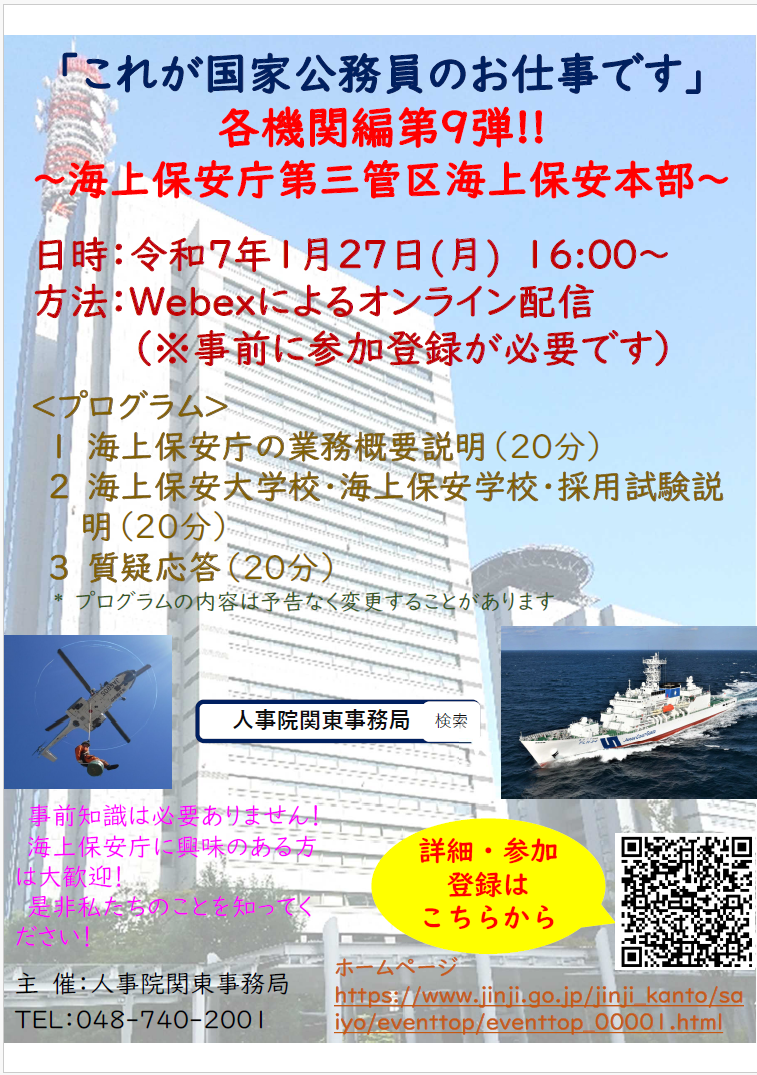 <プログラム> 1 海上保安庁の業務概要説明(20分) 2 海上保安大学校・海上保安学校・採用試験説明(20分) 3 質疑応答(20分) (※)プログラムの内容は予告なく変更することがあります |