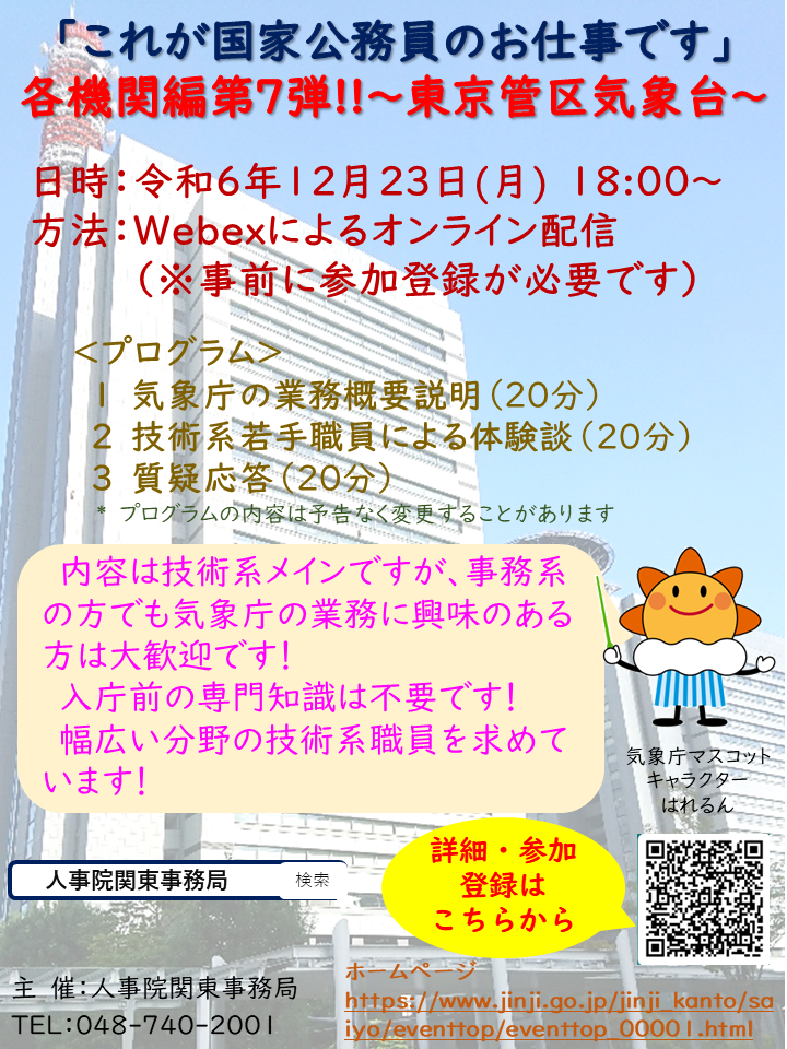 <プログラム> 【事務系】【技術系】 1 気象庁の業務概要説明(20分) 2 技術系若手職員による体験談(20分) 3 質疑応答(20分) (※)内容は技術系メインですが、事務系の方で気象庁の業務に興味のある方は大歓迎です! (※)プログラムの内容は予告なく変更することがあります |
