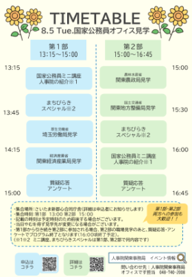 - オフィス見学(①厚生労働省埼玉労働局、経済産業省関東経済産業局、②農林水産省関東農政局、国土交通省関東地方整備局 ※人事院関東事務局は①、②どちらも見学先に入ります)