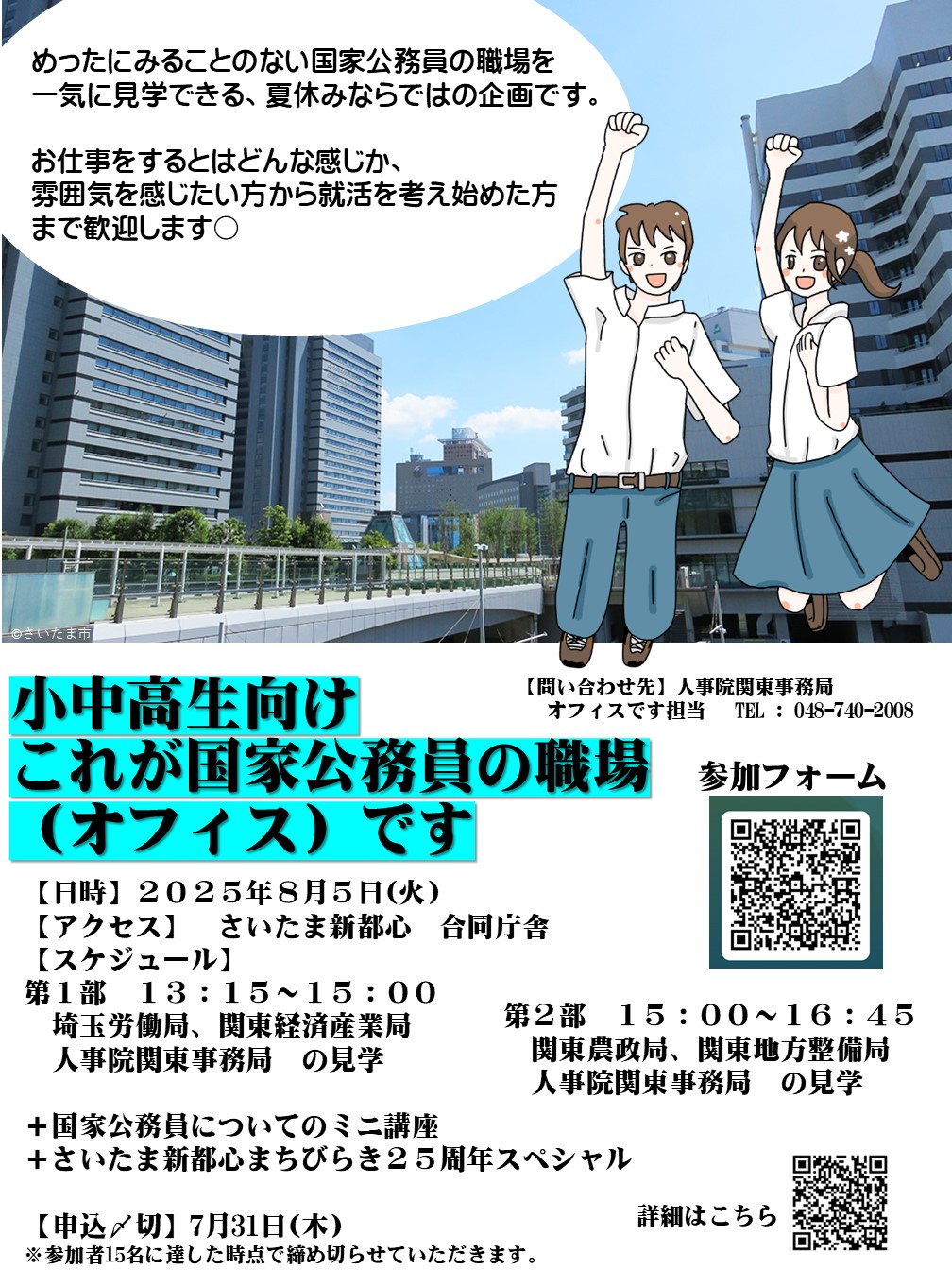人事院関東事務局では、小中高生を対象に、国家公務員合同庁舎(さいたま新都心駅約5分)での、国家公務員のお仕事説明を含めたオフィス(職場)見学を実施します。