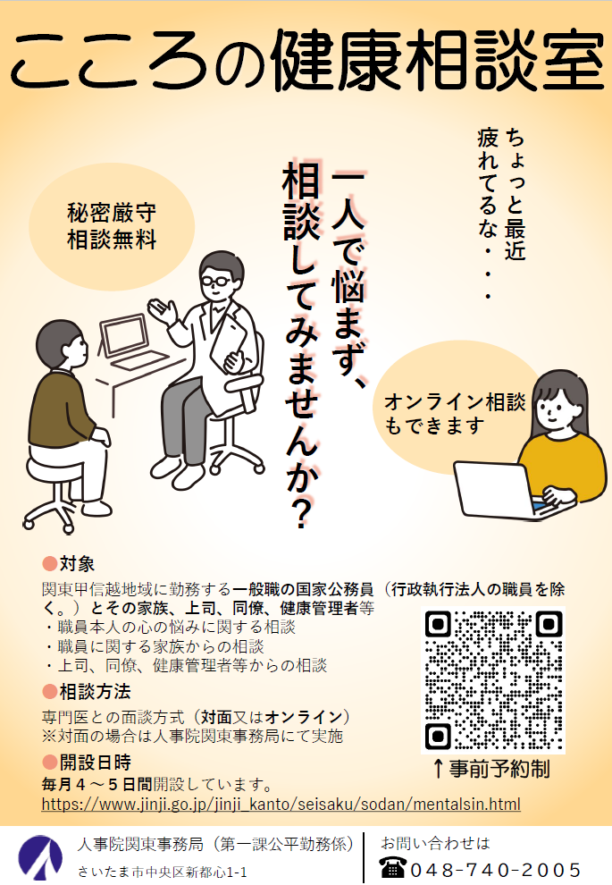 人事院関東事務局では、次のとおり「こころの健康相談室」を開設しています。