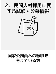 中途採用に関する試験情報・公募情報を知りたい方は、以下のリンク先を御参照ください。各項目をクリックいただくと、それぞれの公募情報の掲載ページ(国家公務員試験採用情報NAVI)に移動します。