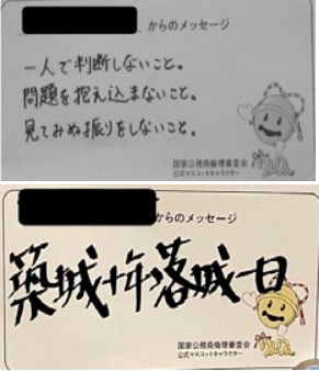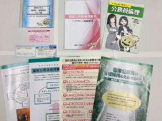倫理審査会は、各府省における研修・啓発活動の充実に資するよう、各種研修教材を制作・配布している。主として新規採用職員及び幹部職員への配布を念頭に、倫理制度の概要や法令が収録された小冊子「国家公務員倫理教本」を改訂し、各府省へ配布するとともに、常時携帯可能な「国家公務員倫理カード」に各府省の相談・通報窓口を記載し、職員に対して配布した。また、各府省におけるeラーニングに資する教材(自習研修教材)として、これまで一般職員用、課長補佐級職員用及び幹部職員用の3階層の教材を提供してきている。令和2年度は、一般職員用教材について、倫理審査会のマスコットキャラクターである「りんりん」を含めイラストを活用し、また、判断に迷うような具体事例を通じて課題に直面した場合の対応の在り方を当事者意識を持って考えさせる内容・構成に改定した。令和3年度は課長補佐級職員用教材について、実務の前線に立つ職員であることに鑑み、倫理規程遵守を図る上でのポイントとなる実践的な内容に厳選して再構成し、併せて違反防止に関する各府省の取組参考例なども盛り込んだ。また、昨今の幹部職員による倫理法等違反事案を踏まえ、課長補佐級職員用教材及び幹部職員用教材について、利害関係者の説明や利害関係者との間での禁止行為について説明を充実させ、各府省へ新たに配布した。さらに、若手職員向けに倫理制度をよりわかりやすく解説したマンガ教材第1巻及び第2巻を「国家公務員倫理教本」と合本した形で職員に配布した。