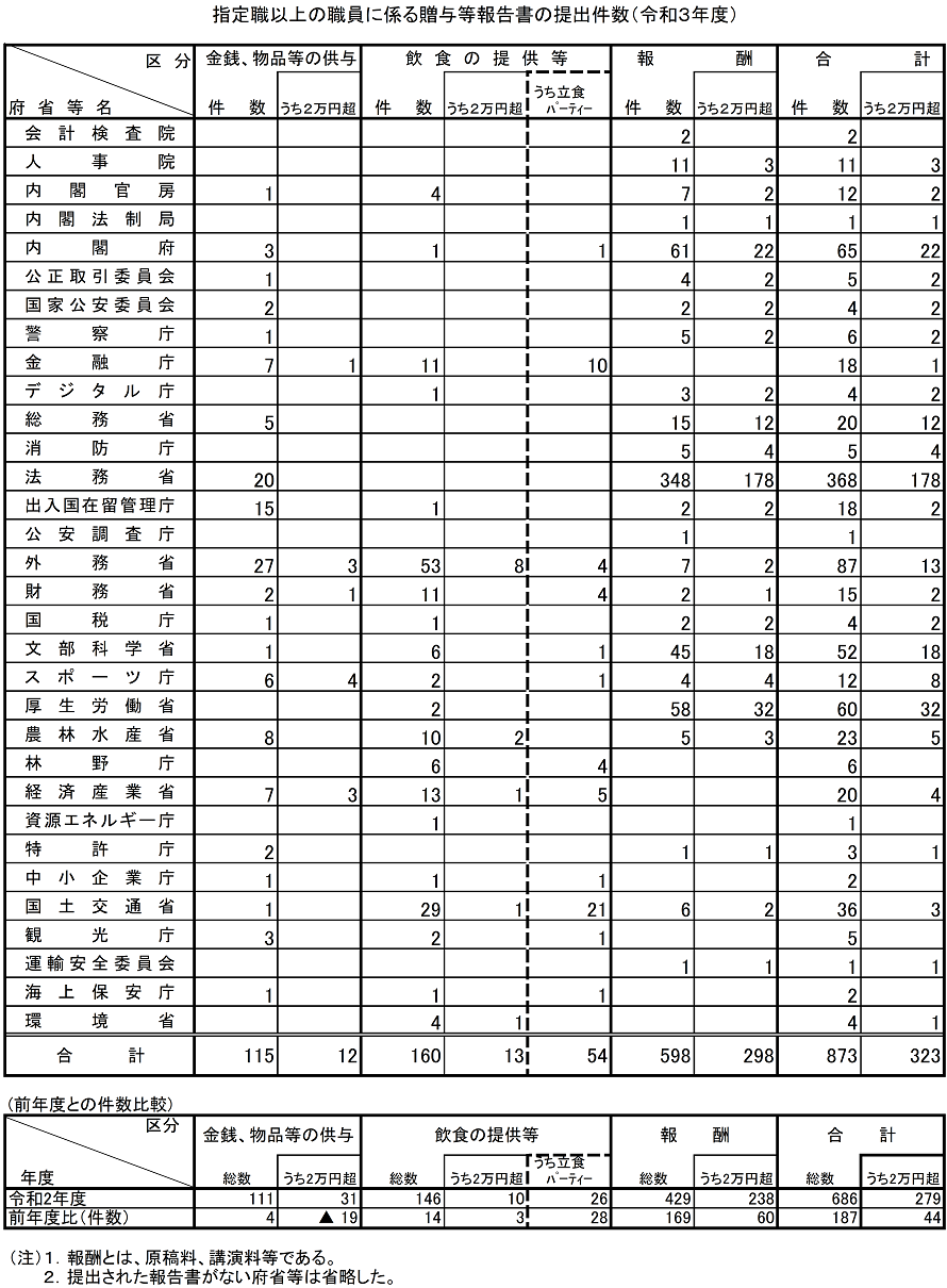 指定職以上の職員に係る贈与等報告書(令和3年度分)並びに本省審議官級以上の職員に係る株取引等報告書及び所得等報 告書(令和3年分)の提出状況等について 1.贈与等報告書について 令和3年度分の贈与等報告書は、四半期ごとに本省課長補佐級以上の職員から各省各庁の長等に対して提出され、そのうち、指定職以上の職員の提出した贈与等報告書については、その写しが国家公務員倫理審査会に送付されており、審査会ではその審査、分析等を行っています。 その結果、倫理法令に違反する行為に該当するものが1件あり、その他については、違反に該当するものは見受けられませんでした。 (注1)指定職以上の職員に係る贈与等報告書の写しの送付件数は、873件(対前年度187件増)でした。 (注2)贈与等報告書を提出した指定職以上の職員は344名(対前年度41名増)でした。 2.株取引等報告書及び所得等報告書について 令和3年分の両報告書は、令和4年3月1日から同月31日までの間に本省審議官級以上の職員から各省各庁の長等に対して提出され、その写しが国家公務員倫理審査会に送付されており、審査会ではその審査、分析等を行っています。 その結果、国民の疑惑や不信を招く不適切な株券等の取引や報酬の受領等は見受けられませんでした。 (注1)各省各庁の長等から送付された株取引等報告書の写しの件数は、107件(対前年13件増)でした。 (注2)各省各庁の長等から送付された所得等報告書の写しの件数は、1,426件(対前年27件増)でした。 |