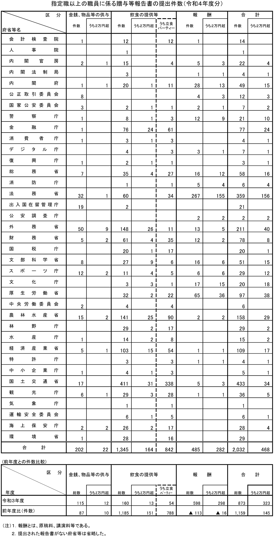 指定職以上の職員に係る贈与等報告書(令和4年度分)並びに本省審議官級以上の職員に係る株取引等報告書及び所得等報 告書(令和4年分)の提出状況等について 1.贈与等報告書について 令和4年度分の贈与等報告書は、四半期ごとに本省課長補佐級以上の職員から各省各庁の長等に対して提出され、そのうち、指定職以上の職員の提出した贈与等報告書については、その写しが国家公務員倫理審査会に送付されており、審査会ではその審査、分析等を行っています。 その結果、現在調査中の1件を除き倫理法令に違反する行為に該当するものは見受けられませんでした。 (注1)指定職以上の職員に係る贈与等報告書の写しの送付件数は、2,032件(対前年度1,159件増)でした。 (注2)贈与等報告書を提出した指定職以上の職員は637名(対前年度293名増)でした。 2.株取引等報告書及び所得等報告書について 令和4年分の両報告書は、令和5年3月1日から同月31日までの間に本省審議官級以上の職員から各省各庁の長等に対して提出され、その写しが国家公務員倫理審査会に送付されており、審査会ではその審査、分析等を行っています。 その結果、国民の疑惑や不信を招く不適切な株券等の取引や報酬の受領等は見受けられませんでした。 (注1)各省各庁の長等から送付された株取引等報告書の写しの件数は、100件(対前年7件減)でした。 (注2)各省各庁の長等から送付された所得等報告書の写しの件数は、1,485件(対前年59件増)でした。 |
