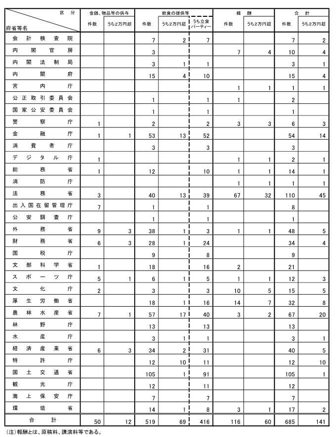 前年同期(令和5年度第2四半期)における提出件数と比較すると、今期は、金銭、物品等の供与が7件の増加、飲食の提供等が45件、報酬が3件の増加となっている。