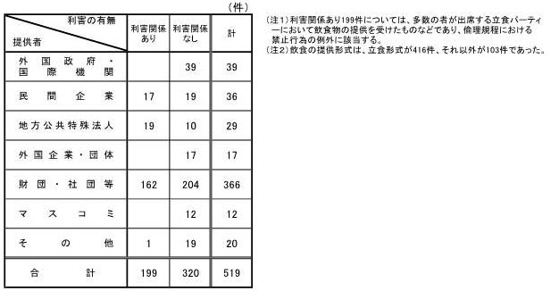 (参考)贈与等の報告制度の概要 (1)本省課長補佐級以上の職員は、事業者等からの贈与等(1件5千円を超えるもの)に関する報告書を提出する義務を負っている。 (2)提出された報告書のうち、1件2万円を超えるものは、各府省等に閲覧を請求することができる。 (3)指定職以上の職員(本省の審議官以上の職員等)の報告書の写しは国家公務員倫理審査会に送付される。 |