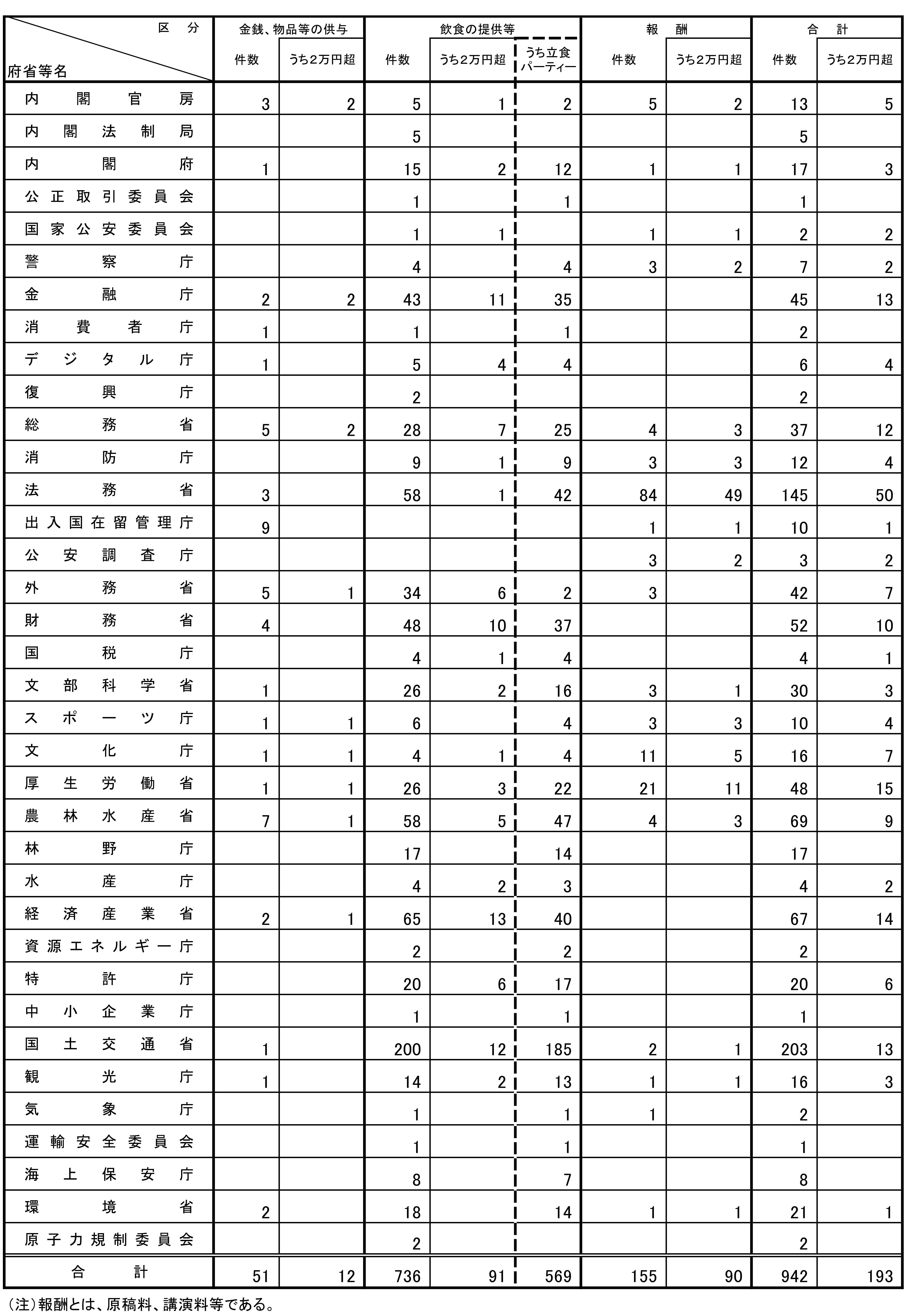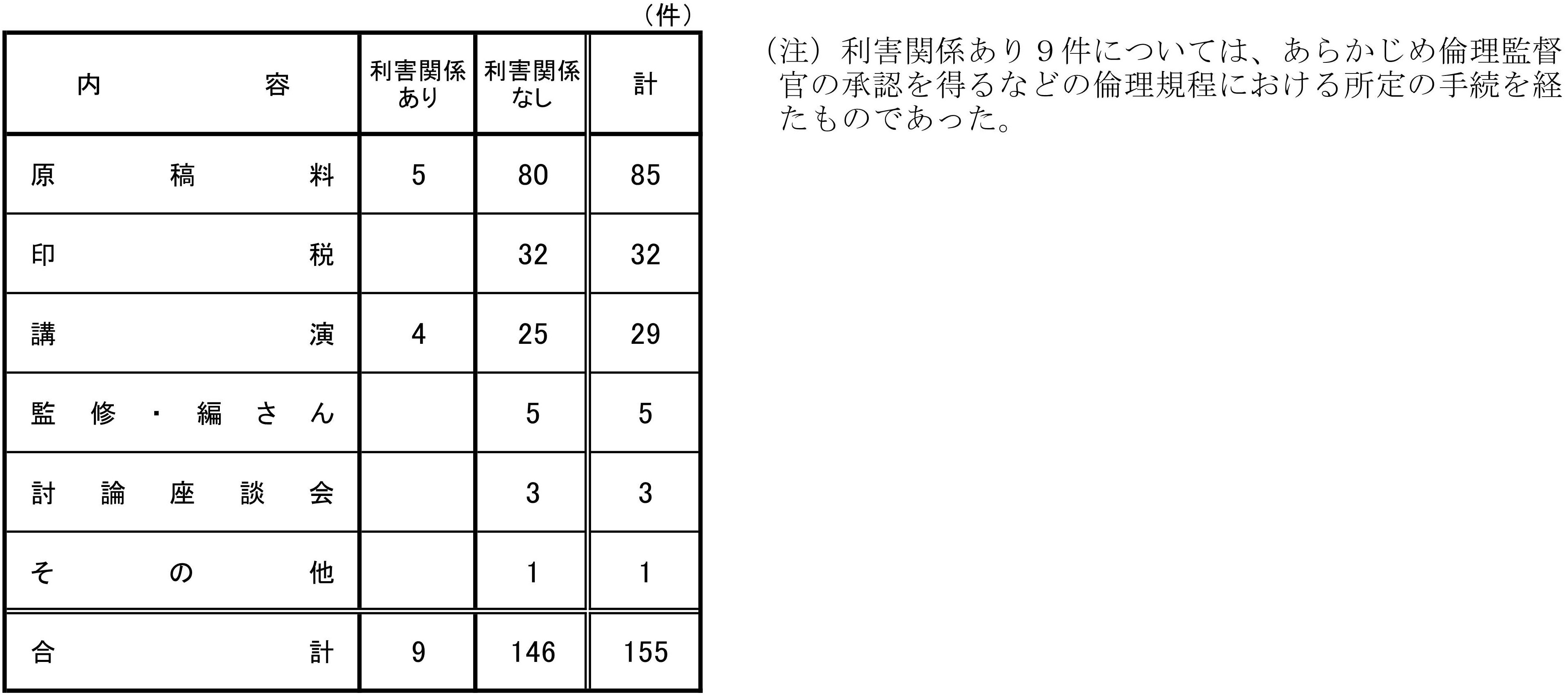 前年同期(令和5年度第3四半期)における提出件数と比較すると、今期は、金銭、物品等の供与が8件の減少、飲食の提供等が86件、報酬が43件の増加となっている。