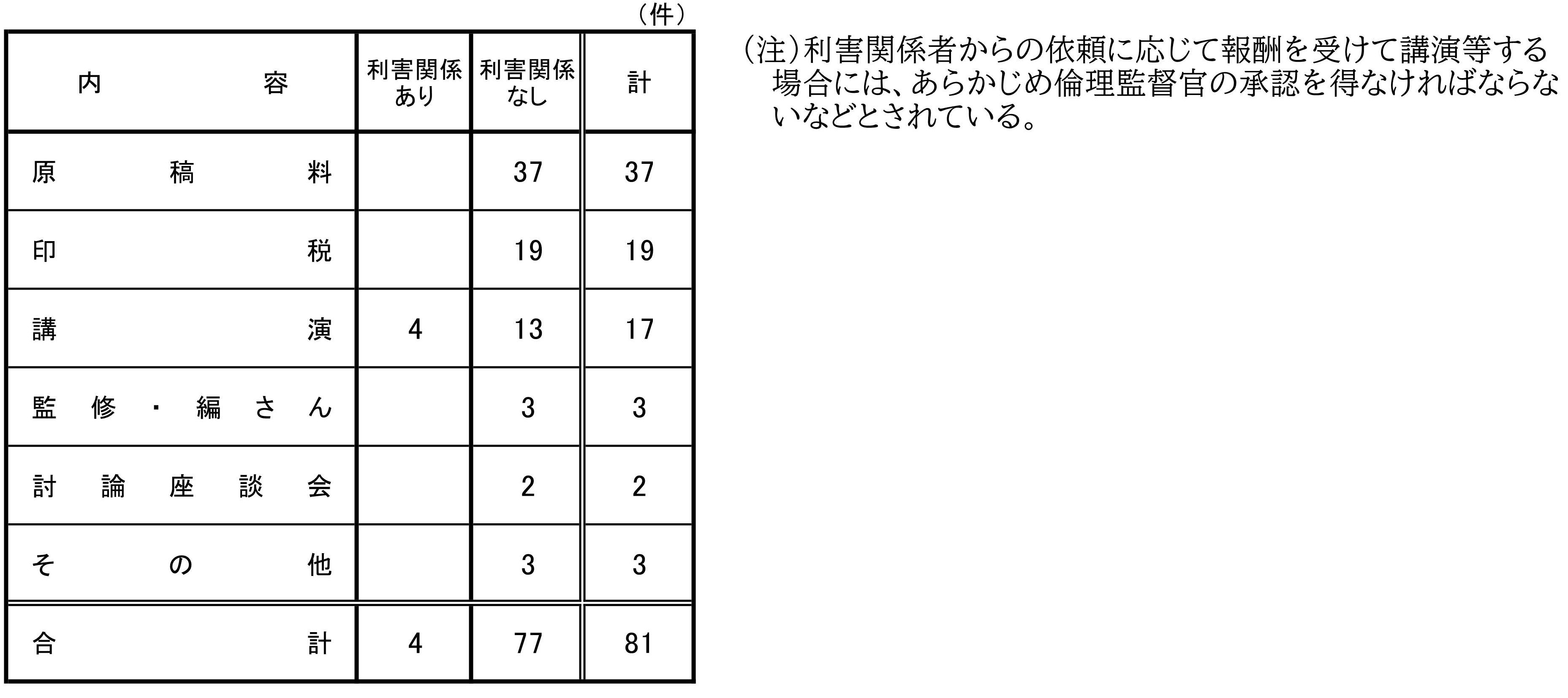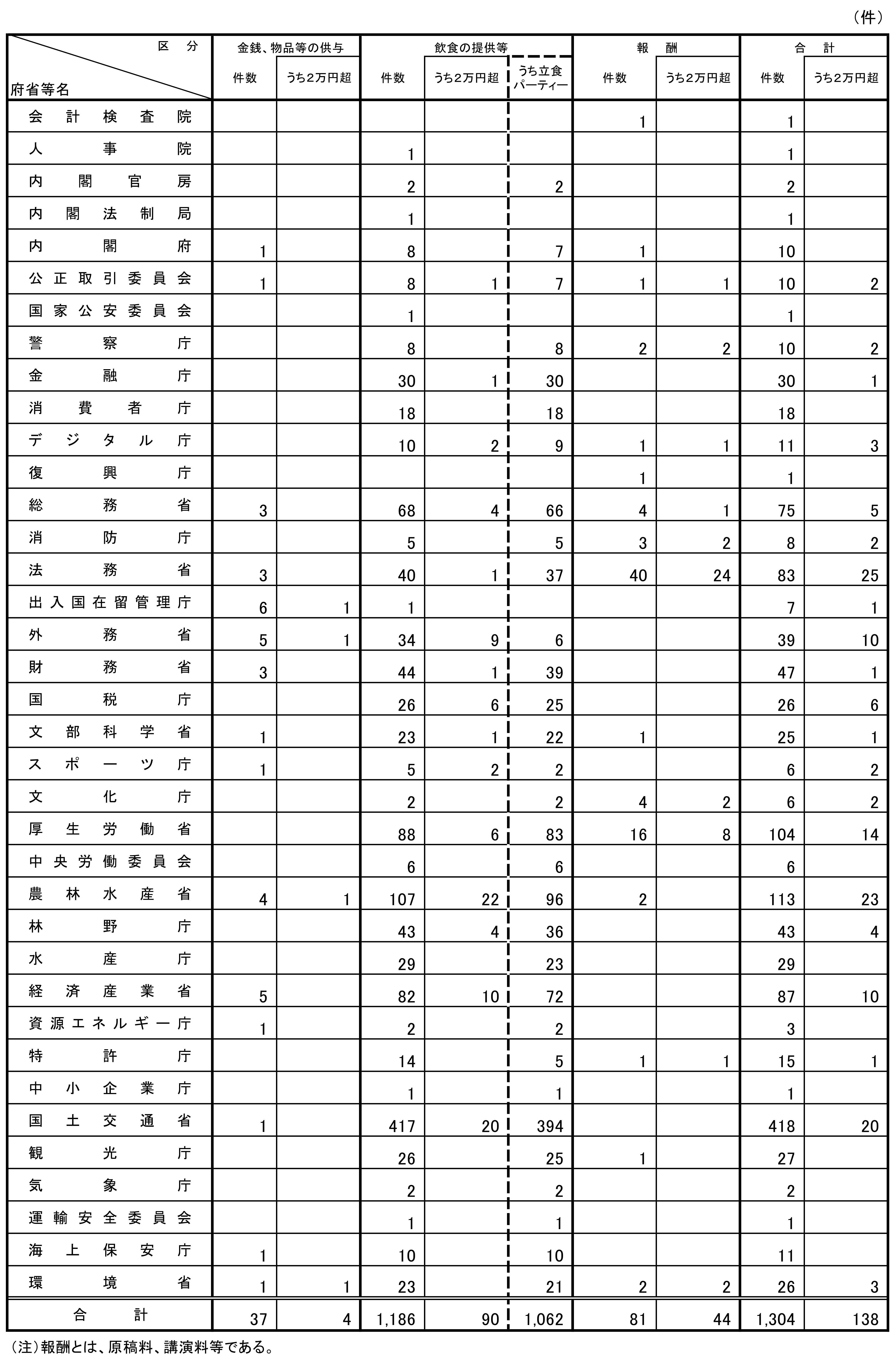 前年同期(令和6年度第1四半期)における提出件数と比較すると、今期は、金銭、物品等の供与は27件の減少、飲食の提供等が96件の増加、報酬が30件の減少となっている。