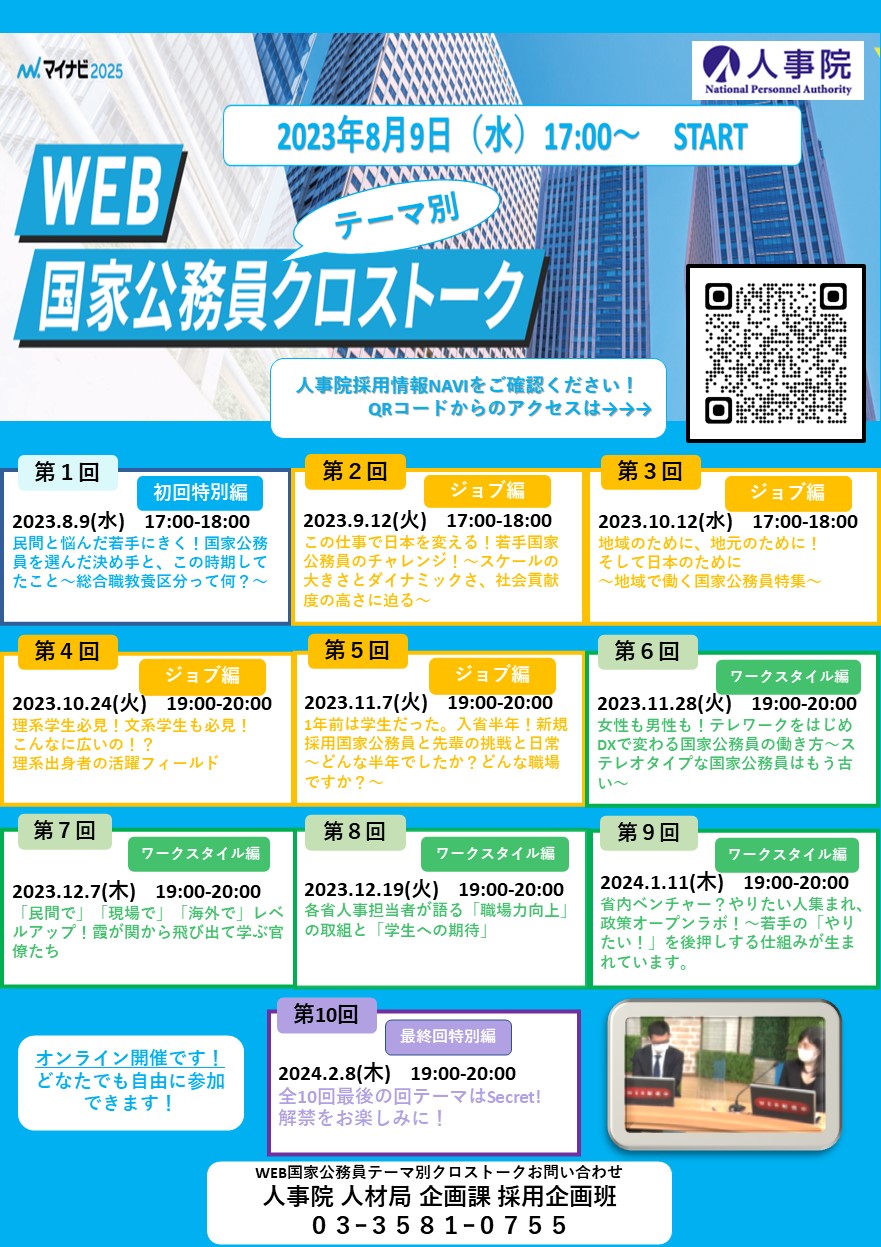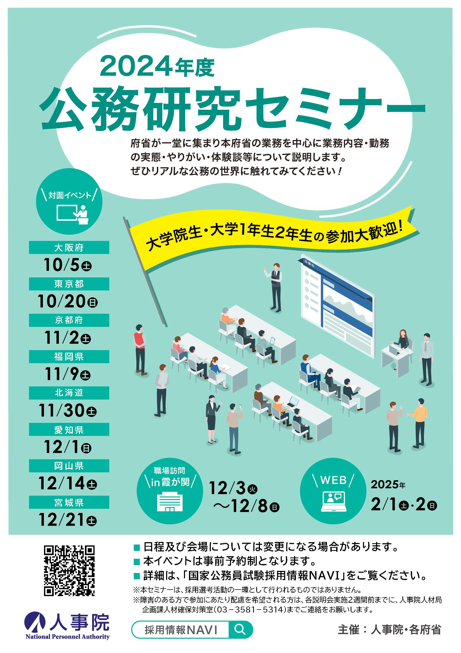 このページでは、国家公務員採用試験、人事院が開催している説明会・セミナーのポスターなどを随時掲載していきます。ぜひご覧いただき、学校内での掲示、学生の皆様への配布などしていただければ幸いです。