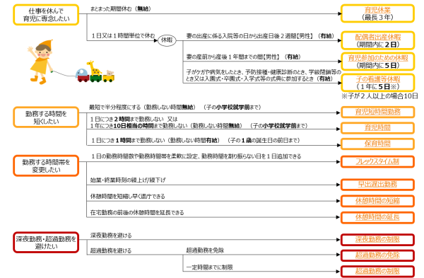○ 以下の制度が利用できます。各制度の詳細については、「妊娠・出産・育児・介護と仕事の両立支援ハンドブック」で紹介しておりますので、ご覧下さい。