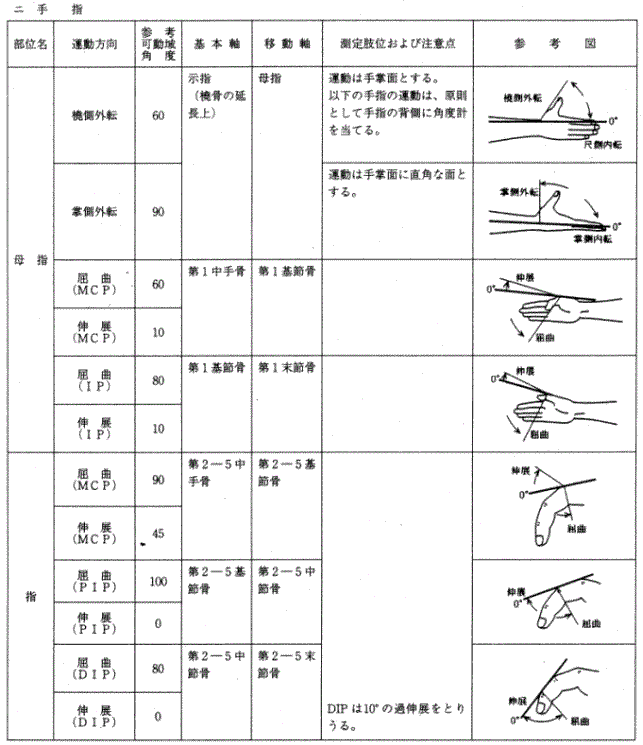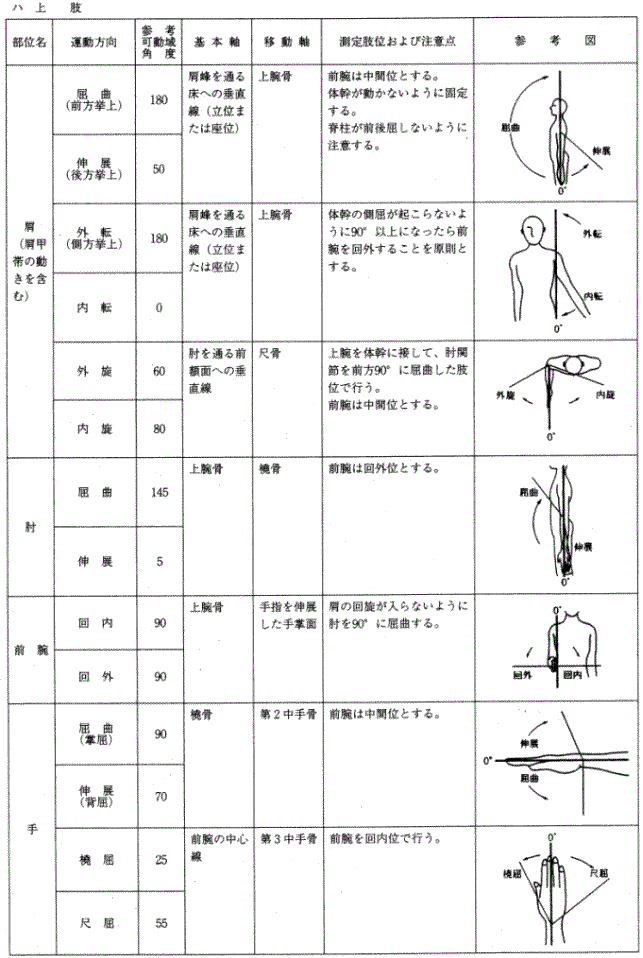 ただし、肩関節の外旋・内旋については肩関節外転0度で肘関節90度屈曲位、前腕の回外・回内については手掌面が矢状面にある肢位、股関節外旋・内旋については股関節屈曲90度でひざ関節屈曲90度の肢位をそれぞれ基本肢位とする。