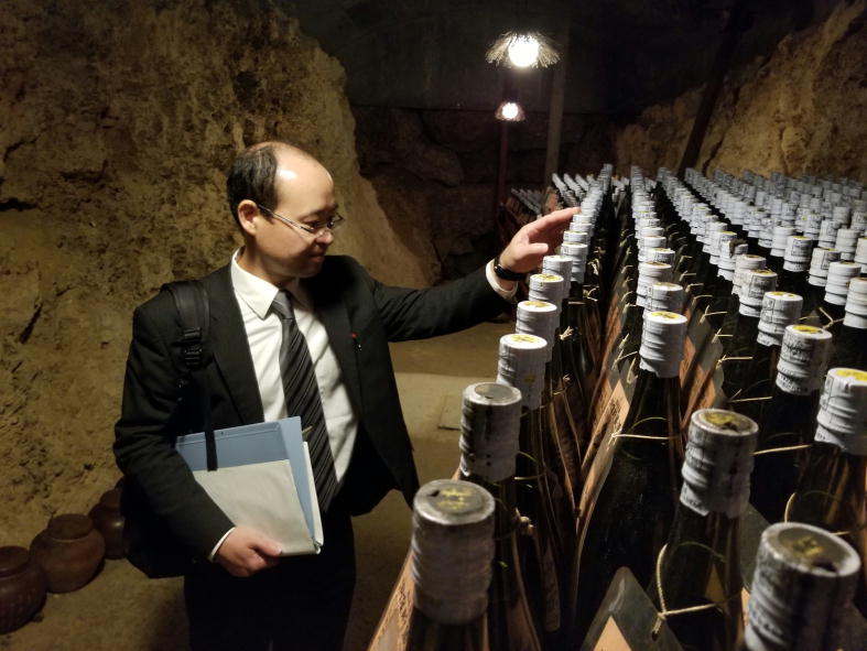 | ▲泡盛の臨場技術相談の様子(瓶貯蔵) |
