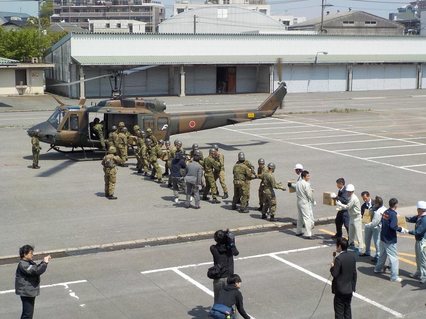 | ▲泡熊本地震後、ヘリ積み込み作業 |