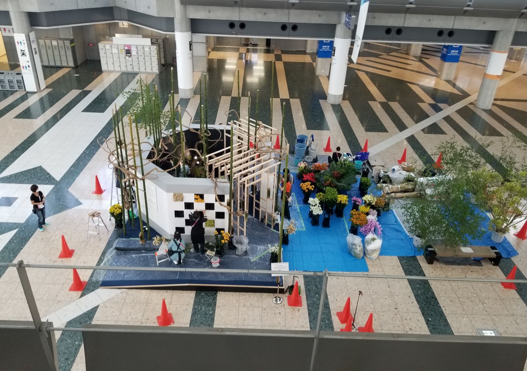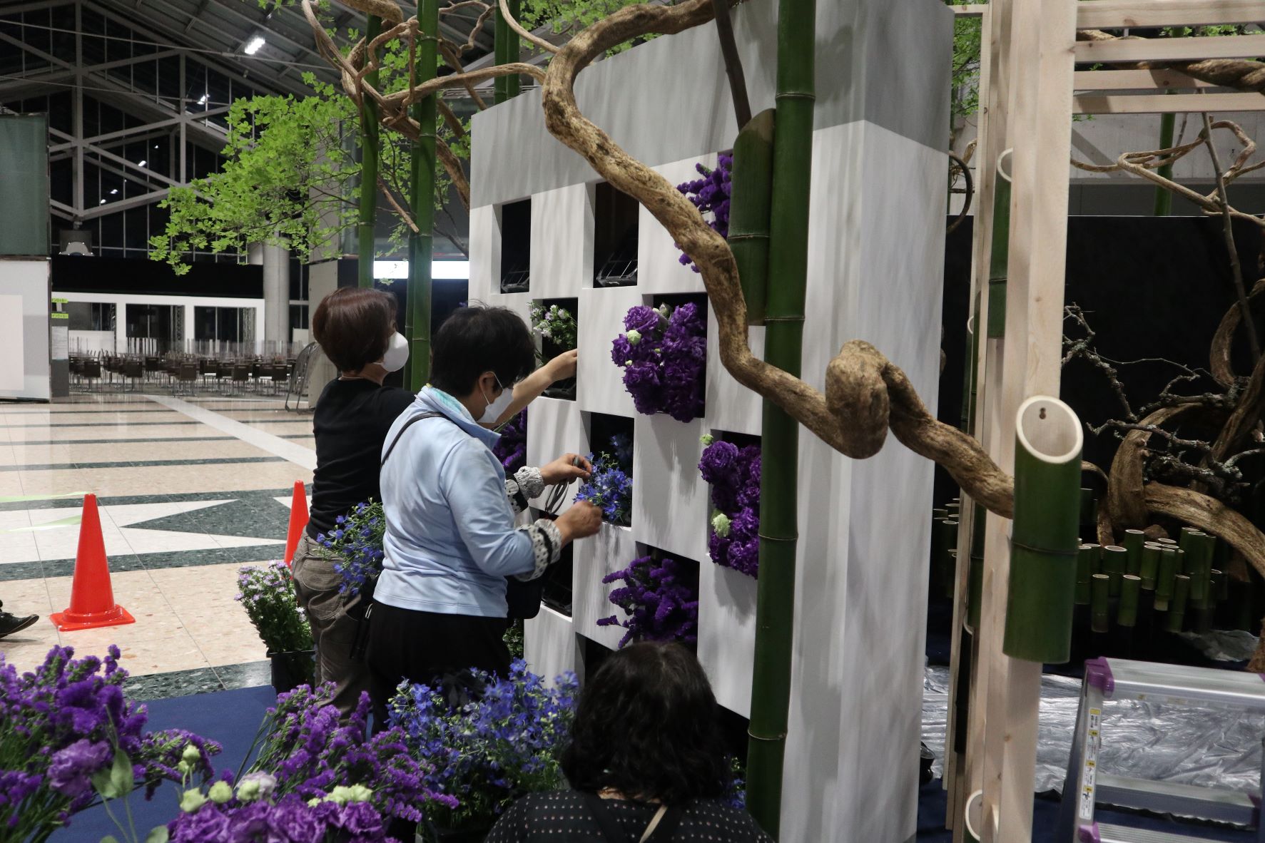 | ▲メインプレスセンターにおけるいけばな展示の制作風景 |