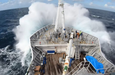 私たちが調査を行った厳冬期の北太平洋は、最大風速毎秒40m超の凄まじい低気圧が絶えず通過して大しけが続き、波の高さが10mに達するなど、運航の常識では調査不可能とされている悪条件のため、過去に十分な調査が行われていませんでした。 しかし、調査実施が困難だからと回避していては、いつまで経っても、未知の領域のままとなり、新たな知見を得ることができません。 雷光が閃き、激しい雨や雹(ひょう)を伴う強風、荒れ狂う海の中、実施不可能とされていた調査に乗組員が一丸となって挑みました。 いかなる大義があったとしても、大きなリスクを伴う調査であったため、特に全体の指揮を執る船長には、数多くの苦悩がありました。 船や乗組員の安全を図りつつ調査の成果を得るという目的を果たすため、常に難しい判断を迫られながらも、有効な進め方や方策を見出すよう努めました。 |