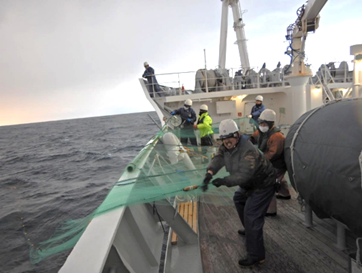| ▲乗組員が一丸となって流し網を揚げる様子 |