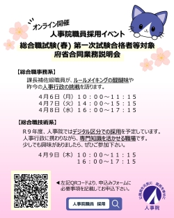 | 4月6日(月) | 【事務系】 総合職試験(春) 第一次試験合格者等対象 府省合同業務説明会 |
