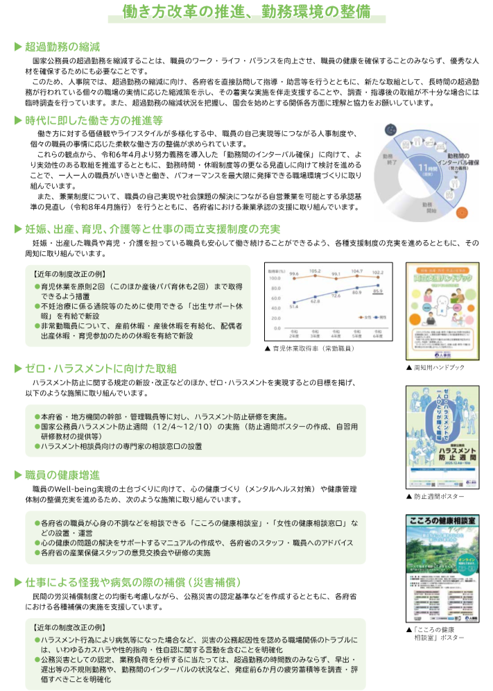 職員福祉局では、公務員にとって働きやすい職場となるよう、勤務時間や休暇を中心とする各種制度の整備を行っています。育児や介護をしながら安心して働き続けることができる支援策の充実、長時間労働の是正に向けた取組、ハラスメントの防止対策、過労死等の防止や心の健康づくり、安全対策、公務上の災害を受けた場合の補償制度など、一人ひとりが尊重され、能力や経験を発揮して活躍できるような改革を進めています。