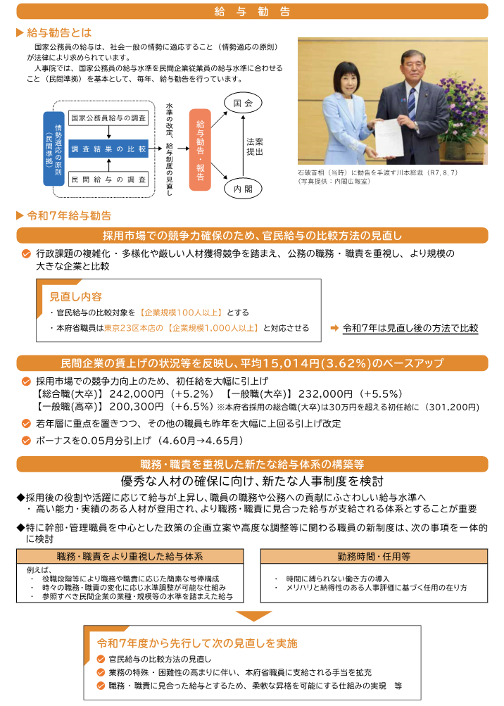 給与は、国家公務員の重要な 勤務条件の一つであり、職員の日々の生活に直結するものです。国家公務員に社会一般の情勢に適応した適正な給与を支給することは、職務に励んでいる職員の努力や実績に報いるとともに、組織活力の向上を通じて、行政の効率的、安定的な運営に寄与するものです。
