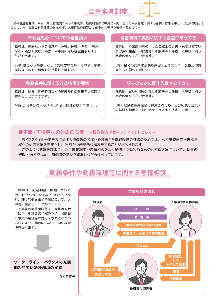 公平審査制度は、中立・第三者機関である人事院が、使用者と職員との間に生じた人事管理に関する苦情、紛争を中立・公正に裁定することにより、職員の利益保護のみならず、人事行政の適正かつ能率的な運営を確保するものです。