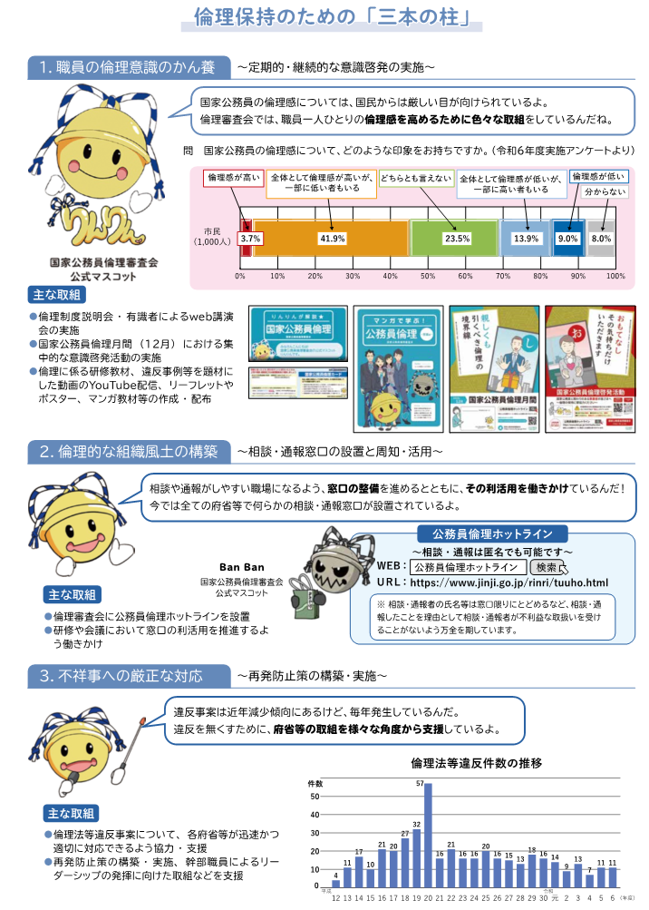 さらに、国家公務員倫理審査会では、次ページで紹介する「三本の柱」を重点課題と位置付け、社会情勢の変化や関係各方面の御意見などを聴取しつつ、様々な倫理保持施策を展開しています。
