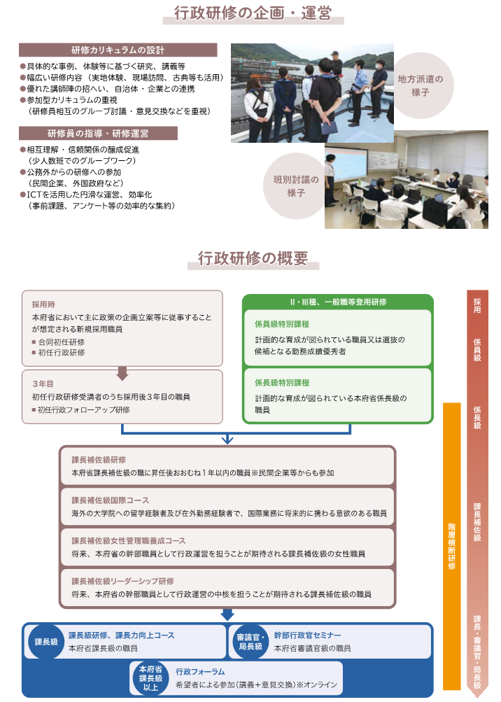 公務員研修所は、各府省の行政運営の中核を担う職員を対象に、役職段階ごとに行政研修を実施する人材育成の現場です。行政研修には各府省や民間を含めた様々な職場から研修員が参加し、第一線で活躍する講師陣からの講義のほか、研修員同士による発表や討議、現場体験などが行われます。研修を通じ、国民全体の奉仕者としての使命感の醸成や、府省の枠にとらわれない広い視野と柔軟な発想などの行政官に求められる資質・能力の向上、政府職員としての相互理解と信頼関係の構築を目指しています。