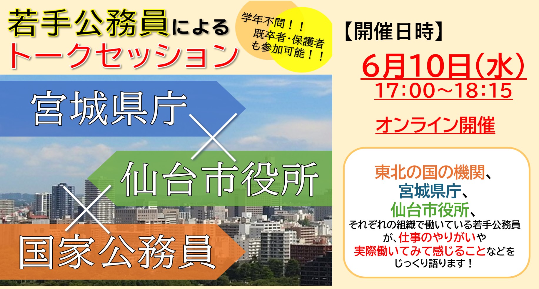 「国家公務員×宮城県庁×仙台市役所 若手公務員によるトークセッション(6/10(水)実施)の情報を公開しました。