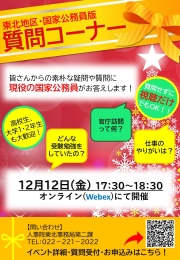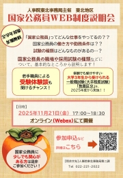 ![]() 採用試験のことや働いて感じていることなど、皆さんからの疑問や質問に人事院東北事務局の職員がお答えするイベントです。 画像をクリックするとチラシのPDFが開きます→ |